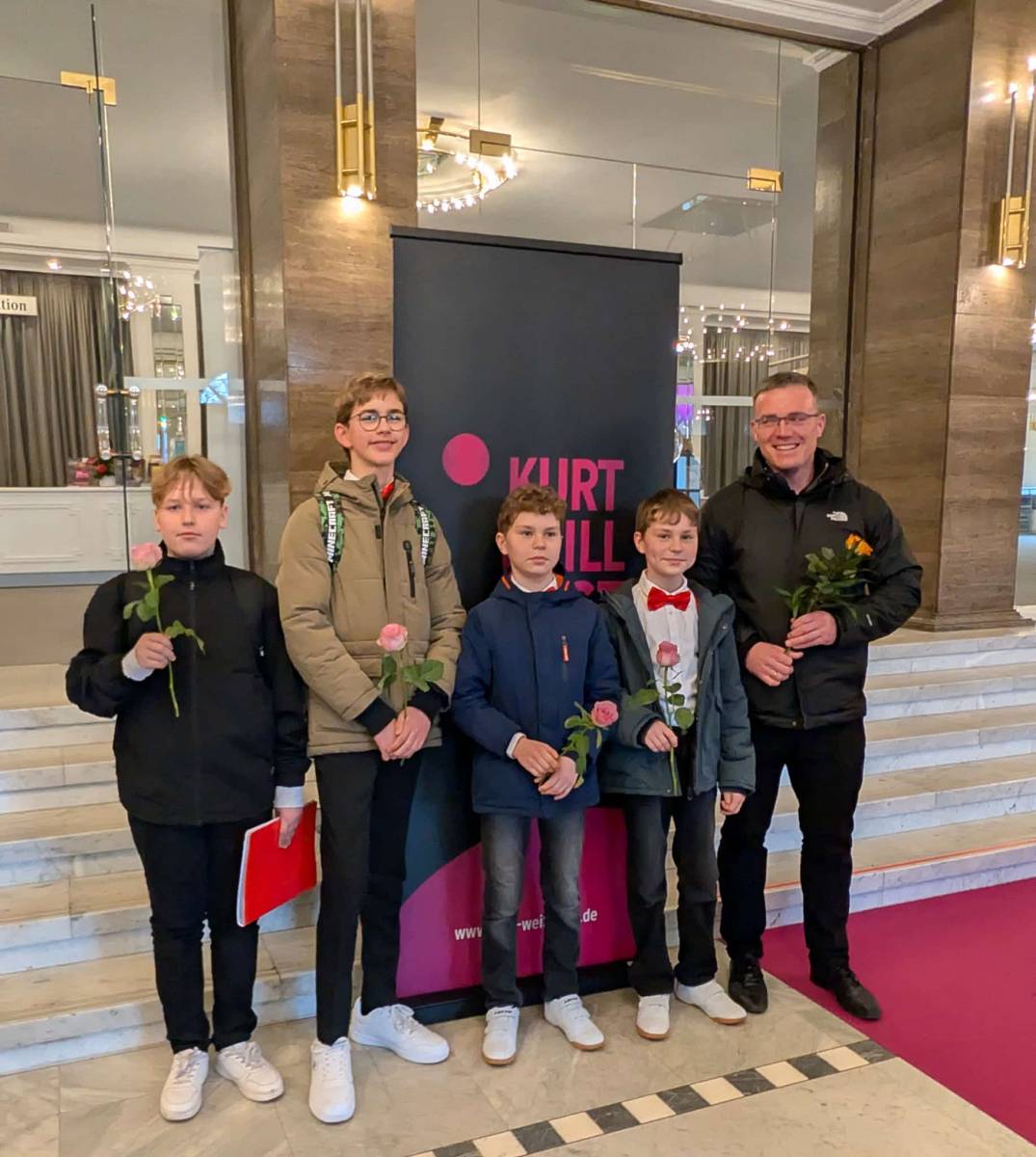 4 Schüler unserer Schule durften am 15.03.2026 Preisträgerkonzert innerhalb des Kurt-Weill-Festes im Anhaltinischen Theater Dessau teilnehmen. Als Auszeichnung für ihre erfolgreiche Teilnahme am Wettbewerb "Jugend Musiziert" im Januar durften Johannes und Antonius Windirsch (beide Trompete), Jaro Franz (Posaune) und Philipp Roß (Tuba) vor einem großen Publikum ihr Können noch einmal unter Beweis stellen. Die Besonderheit ist, dass alle anderen Preisträger ihre Ausbildung nicht in der Schule, sondern in Facheinrichtungen wie Musikschule, oder Landesgymnasien für Musik erhalten.