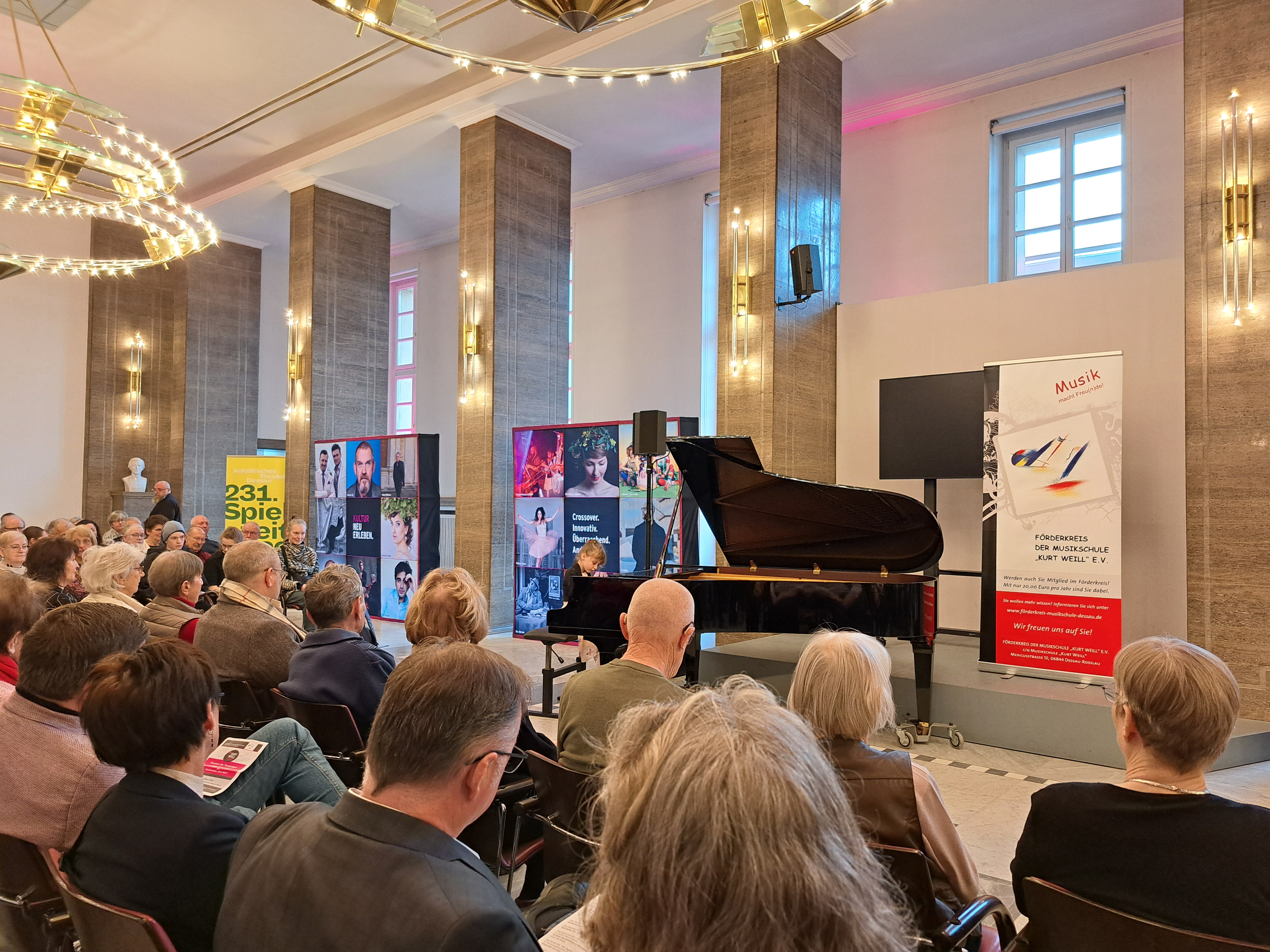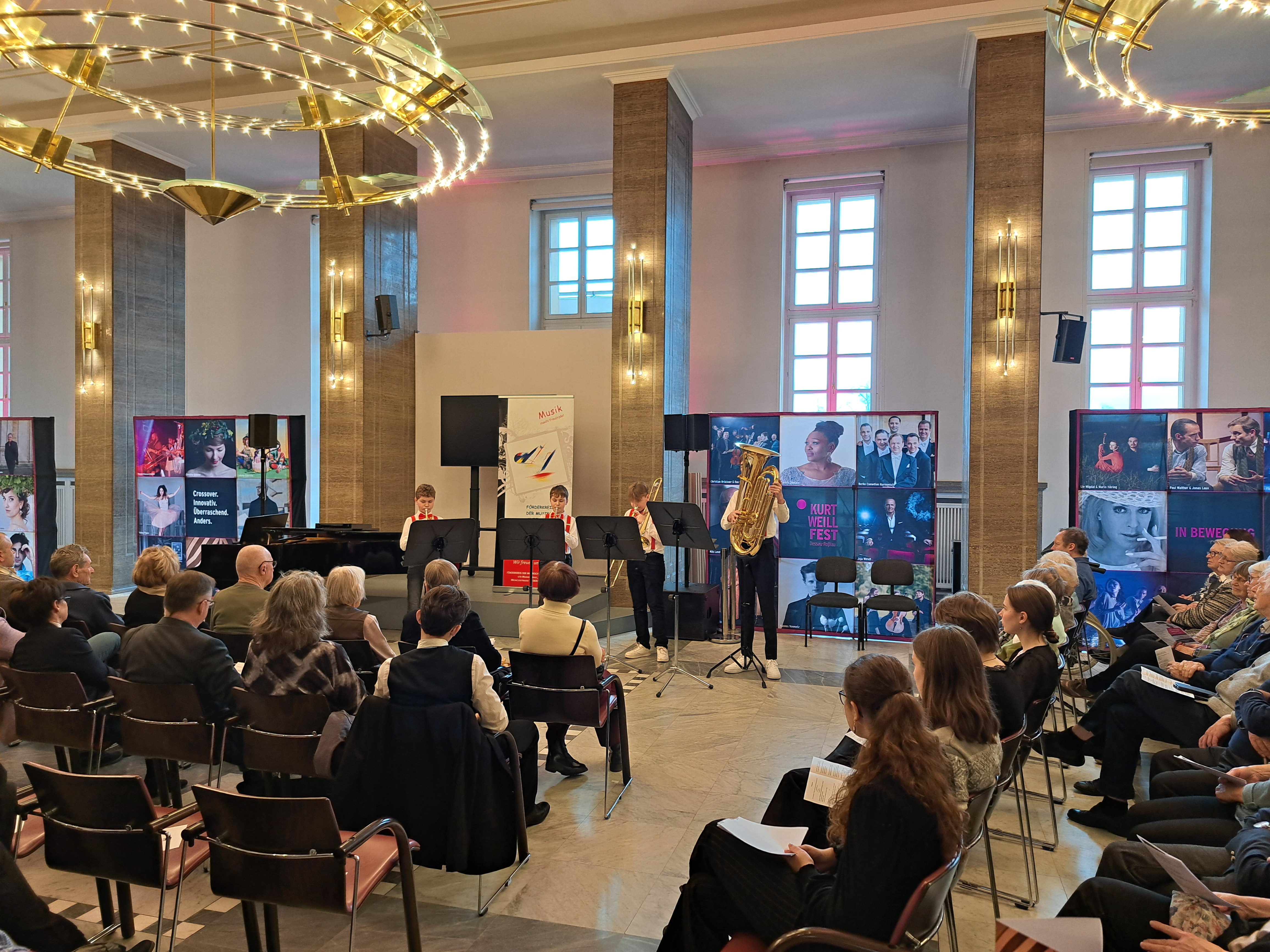 4 Schüler unserer Schule durften am 15.03.2026 Preisträgerkonzert innerhalb des Kurt-Weill-Festes im Anhaltinischen Theater Dessau teilnehmen. Als Auszeichnung für ihre erfolgreiche Teilnahme am Wettbewerb "Jugend Musiziert" im Januar durften Johannes und Antonius Windirsch (beide Trompete), Jaro Franz (Posaune) und Philipp Roß (Tuba) vor einem großen Publikum ihr Können noch einmal unter Beweis stellen. Die Besonderheit ist, dass alle anderen Preisträger ihre Ausbildung nicht in der Schule, sondern in Facheinrichtungen wie Musikschule, oder Landesgymnasien für Musik erhalten.
